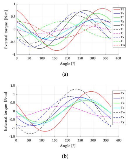 Just by using two sets of masses and positioning them at the same time, that is, two occupied holes in the disk, 12 different load schemes would be obtained. The resultant external torque by (a) two sets of masses and (b) four sets of masses, located asymmetrically in the perforated disk are reported in Figure 3. It is worth noting that masses located symmetrically do not induce external torques.