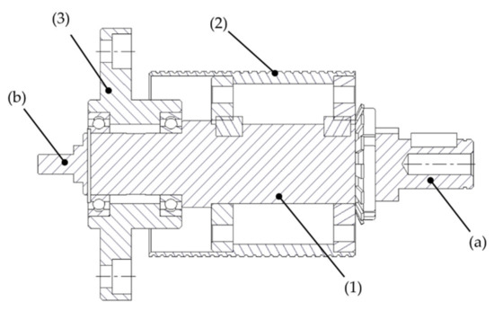 The motor shaft assembly, shown in Figure 5, consists of the bracket (1), the shaft (2), and the tensioner (3). In this case, the shaft has grooves over its surface for cable guidance. The movement from the motor shaft to the pulley is transmitted using a single cable; this cable has coupling ends that fit at points (a) and (b) in the shaft. The input encoder is coupled at point (c) of the shaft.