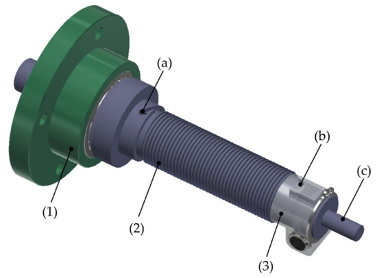CAD model of the motor shaft system: (1) bracket; (2) shaft; (3) tensioner; (a,b) cable connection points; (c) end of the shaft for encoder clamping.