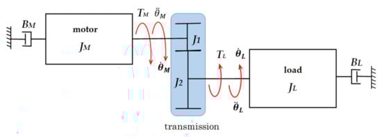 where TM is the motor torque, TL is the load torque, JM the motor inertia, JL the load inertia, R is the transmission ratio, BM is the viscous damping coefficient of the motor, BL is the viscous damping coefficient of the load, is the load speed, and is the acceleration of the load.