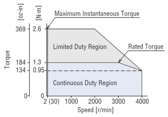 Once the motor torque was calculated, and the transmission requirements were established, a BLDC (brushless DC motor) was selected. This BLDC motor is powered by 200–240 single-phase or three-phase VAC, it has a power of 400 W (1/2 hp) and can vary its speed between 2 and 4000 rpm. The maximum permissible instantaneous torque is 2.6 N·m and the maximum torque for continuous operation up to a speed of 3000 rpm is 1.3 N·m·(Figure 7).