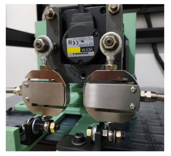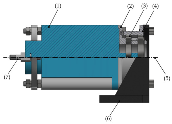 It was decided to use the motor support forces to estimate the reactive torque. To measure the reactive torque, it was necessary to redesign the way the motor is fixed to the structure of the machine; normally, the motors are screwed to their base. The screws between the motor base and the machine were eliminated; instead, a system was designed in which the motor body is connected by an extension to two ball bearings. This system allows the motor to swing around an imaginary axis passing through the motor shaft. As shown in Figure 8, the motor body (1) is screwed to the internal coupling (2), which is assembled to the internal part of the bearings (3). The bearings are assembled to the external coupling (4) which is fixed with screws to the support (6). The support is screwed to the machine frame; thereby, the motor can rotate freely about the axis (5). Load cells type S are used to restrict the free rotation of the motor body around the axis (5); they are mounted at equal distances from the motor shaft on the rear of the motor. With this configuration, one of the cells is subjected to a compression force, while the other is subjected to a tension force, as seen in Figure 9.