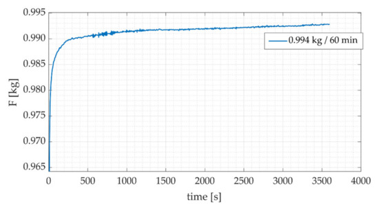 To determine the creep, various tests were performed using different calibrated weights and different measurement times. The overall results obtained match those observed in early studies [33,34,35,36]: (a) the creep value depends on the applied load, so the higher the load, the greater the creep, (b) the creep stabilizes after 30 min. In addition, from the data graphs it was observed that the initial behavior of the reading is not linear and that it is not possible, by simple inspection, to identify the exact point where the creep begins (Figure 10). However, despite not being able to identify the beginning of the creep, it is possible to establish that 95% of the load is reached about one second after the load has been applied.