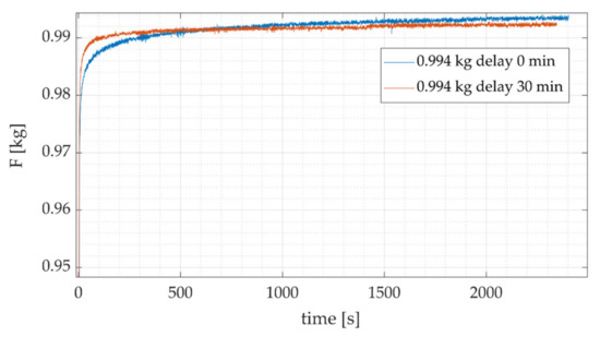 An important finding is that creep behavior varies as a function of the time elapsed between the instant the load cell is energized and the instant the measurement is performed. The creep behavior for the same load, measured just after the load cell has been energized, and measured with a time interval of 30 min after it is energized, is shown in Figure 11. The two measurements show the typical creep behavior, however: