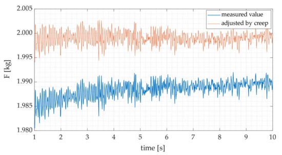 As can be seen in Equation (6), the actual force applied to the load cell (Fa) can be estimated based on the measured force (Fm) and the time (t) elapsed between the application of the force and its measurement. Figure 13 shows the measured load and the load adjusted using Equation (6).