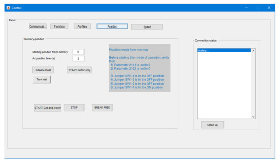 - “Speed” operating mode: this mode allows executing one of the 16 step-type speed profiles previously stored in the controller. It is possible to concatenate up to three continuous speed profiles. The interface of the “Control” program in the “Speed” operating mode is shown in Figure 14.