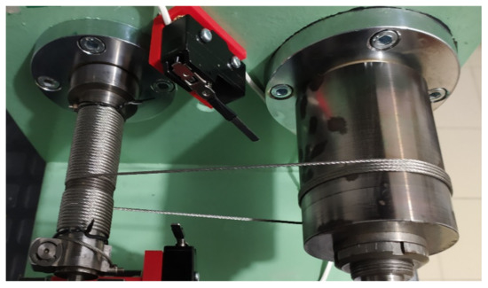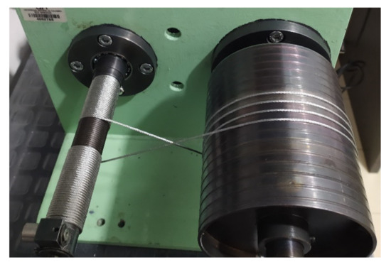 Previous works on cable-driven transmissions [28,29,30,31,32] have involved the use of test benches developed specifically for each research project, but the majority of these systems have issues that need to be considered in more detail to evaluate friction. In this paper, a test bench for a cable-driven transmission is proposed; this test bench was developed at the Universidad Tecnológica de Pereira, in alliance with Universidad Nacional de Colombia. Some differential features of this new test bench from the previous ones are: (i) the ability to evaluate the effect of more than one turn of cable wrapping, (ii) the chance to change input shaft and pulley to evaluate different transmission ratios and possible materials, with and without groves, and (iii) here there is no transmission behind the cable transmission.