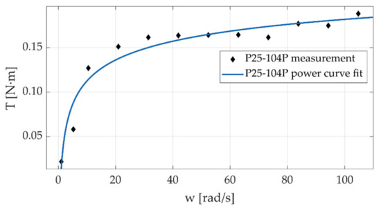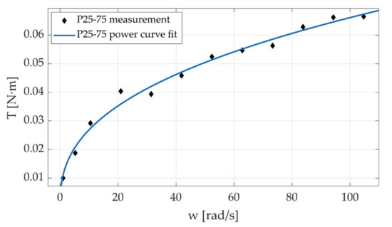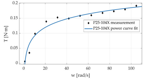 In these first experiments, the motor was moved following a trapezoidal velocity pro-file at different magnitudes. Testing was conducted ranging from 1 rad/s to 105 rad/s; the angular position of the motor shaft and reactive forces in the load cells were sampled at 5 kHz. The speed range chosen for the experiments covers a wide range of speeds found in commercial robotic manipulator joints. By using the 25 mm screws, the bench can be adjusted to produce transmission ratios up to 10:1. Before performing the torque calculation, the reactive force signals were filtered using wavelets (db10 with 10 levels). The measurements of angular position and the corresponding sampling time were employed to compute the velocity of the input shaft in each experiment. The values of torque and velocity during the constant velocity stage of the trajectory were averaged and used to construct the torque-speed plots (Figure 18, Figure 19, Figure 20 and Figure 21).