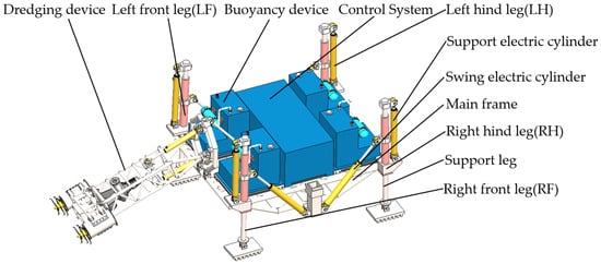 The three-dimensional schematic diagram of the dredging robot is shown in Figure 2, which mainly includes the dredging device, outriggers, buoyancy device, main frame, and control system. LF, LH, RF, and RH represent the left front leg, the left hind leg, the right front leg, and the right hind leg, respectively. Each leg includes a supporting electric cylinder, a swing electric cylinder, and a supporting leg. The supporting electric cylinder can provide sufficient supporting force of the supporting leg to lift the body, and the swing electric cylinder can adjust the angle of the supporting leg relative to the body. There is friction between the foot and the support leg, which makes the angle between the foot and the support leg remain unchanged during the lifting process of the leg until it contacts the ground. After the foot landed, this angle is determined by the angle between the ground with the horizontal plane and the angle between the supporting legs with the horizontal plane.