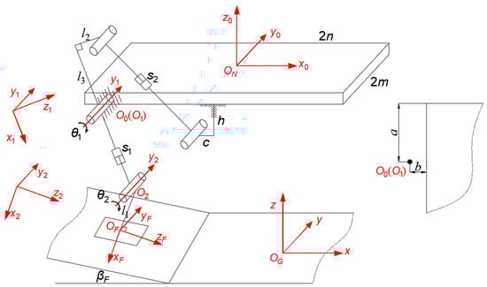 The four outrigger mechanisms of the dredging robot are geometrically symmetric about the fuselage, and therefore, only the fuselage and one outrigger are analyzed. The kinematics model of four outrigger mechanisms is established, as shown in Figure 3. We define the rotary joint between the supporting leg and the body as the hip joint, and the rotary joint between the supporting leg and foot as the ankle joint. βF is the angle between the ground and horizontal plane.