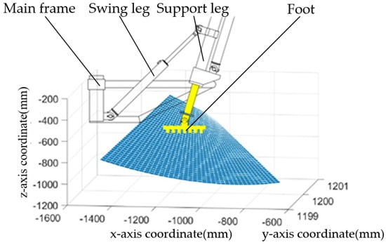 Using the above equation, we can obtain the coordinates NXF, NYF, NZF representing the upper center of the body in the geodetic coordinate system, which are, respectively, equal to the three elements in the fourth column of the change matrix. Bring the above constants and variables into Equation (1) to obtain the foot’s motion range, as shown in Figure 4.