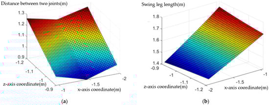 The length of the supporting leg and swinging leg in the desired coordinates: (a) foot coordinates corresponding to s1 size and (b) foot coordinates corresponding to s2 size.