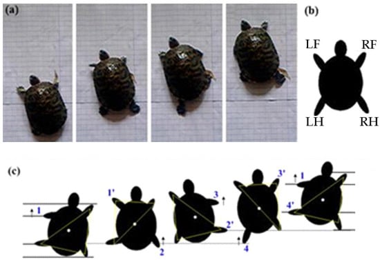 Figure 7a shows the coordinated gait of a tortoise. The four legs of the tortoise and their corresponding symbols are shown in Figure 7b. When the tortoise crawls, the center of gravity is in the stable area composed of limbs on the ground, and the step sequence relationship between the limbs of the triangular gait can be defined as 1—1′, 2—2′, 3—3′, 4—4′, as shown in Figure 7c [].