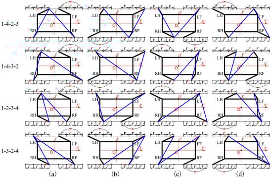 Gait diagrams in different sequences. (a) the moving of LH and RF, (b) the moving of LH, and RH, (c) the moving of LF, and RF, (d) the moving of LF and RH.