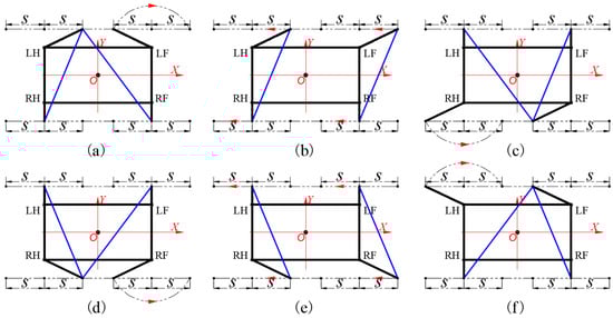The motion state of the experimental prototype in a cycle in the mixed gait: (a) the RH is about to lift, (b) the RF is about to lift, (c) adjust the center of gravity for the first time, (d) the LH is about to lift, (e) the LF is about to lift, and (f) adjust the center of gravity for the second time.