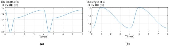 In the process of foot trajectory planning, the change of the foot position of the dredging robot with time is obtained, which is put into the solution equation of the RH s1 and s2, and the time change of the RH leg s1 and s2; the curves are shown in Figure 13a,b.