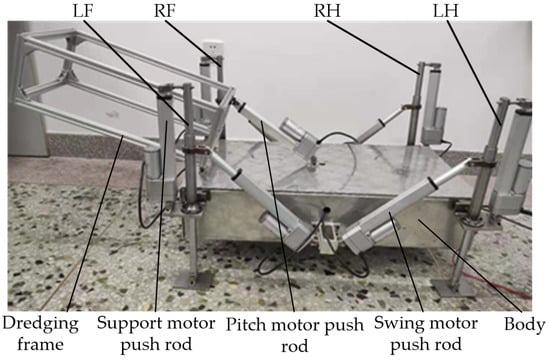 The body size of the experimental prototype of the dredging robot is designed to be 800 mm in length, 400 mm in width, and 160 mm in height. Nine motor push rods are installed on it to replace the electric cylinder of the dredging robot in engineering, as shown in Figure 14. There are four support motor push rods and four swing motor push rods of LF, RF, LH, and RH, respectively, which serve as the support telescopic mechanism and the swing telescopic mechanism, and one pitch motor push rod is responsible for driving the rotation of the dredging frame. The power and signal lines on the motor push rod are connected to the power and signal lines in the box through the round hole on the box body.