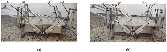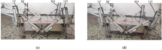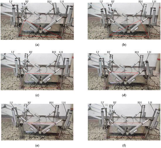 Figure 17a,b are the moments when the RH and RF are moved to the extreme position, and the rest of the outriggers maintain their current posture during the lifting process. The length change of the motor push rod of the swing leg is the same as the coordinated gait. The process shown in Figure 17c–e to a indicates the four-legged support adjustment stage of the experimental prototype to ensure that there is sufficient stability margin during movement. During this process, the supporting motor push rods are all shortened. The swing motor push rod of the hind leg is shortened, and the swing motor push rod of the front leg is extended. Figure 17d,e show the state of the moment when the LH and LF are about to lift after the feet are moved to the extreme position.