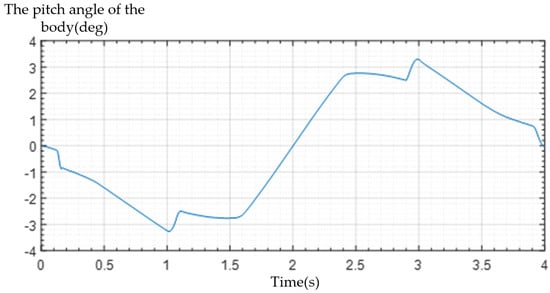 Figure 16 is the change curve of the pitch angle of the experimental prototype body measured according to the gyroscope and the host computer software. It can be seen that the angle change range is between −3.5°~3.5°. Additionally, this can ensure that there is a sufficient safety distance between the bottom of the body and the ground during the movement.