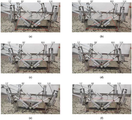 Figure 18a,b shows the moments when the RH and RF are moved to the extreme position, which is the same as the intermittent gait. The difference is that the remaining three legs support the body during the lifting process before swinging. The length change of all motor push rods during exercise is the same as the coordinated gait. The process shown in Figure 18a–f indicates the four-legged support adjustment stage of the experimental prototype. Figure 18d,e shows the moments when the LH and LF are about to lift after the feet are moved to the extreme position.