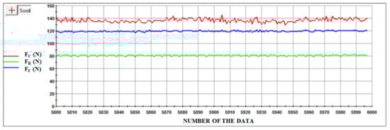 The resultant cutting force is divided into three components of cutting force in a simple turning operation: tangential (FC), axial (FF) and radial (FR). The motive for measuring the cutting forces in machining operations comes from their major effect on cutting tool wear, cutting temperatures, the vibration mechanism and consequently the surface texture of the workpiece [,]. As such, cutting forces are one of the significant characteristics in machining operations [,]. Although cutting forces are calculated theoretically, complex turning processes can reveal unexpected developments. Therefore, actual measurements become important, especially for industrial applications, as they provide cleaner results.