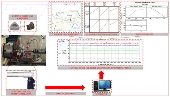 One of the greatest challenges for machining industries is to overcome excessive energy consumption []. The fundamental necessity for reducing outgoings is to shorten the machining time []. The power employed for chip removing needs to be considered for this reason as well. Machining time is directly affected by the material removal rate assigned with basic machining parameters, i.e., cutting speed, feed rate, and the depth of the cut []. Cutting powers, as well as cutting force, are also affected mostly by these three parameters. Theoretically, the cutting force is obtained by multiplying the specific cutting force by the chip area, which is a function of feed rate and depth of cut []. Because increasing the cutting parameters increases MRR and cutting power at the same time, there are uncertainties in the selection process of suitable parameter combinations []. Therefore, there is always a need for an effective optimization method to determine the optimum combination of parameters [,,]. This is important in terms of the sustainability assessment, which covers the consumed energy, machining costs, and eco-friendly manufacturing [,,].