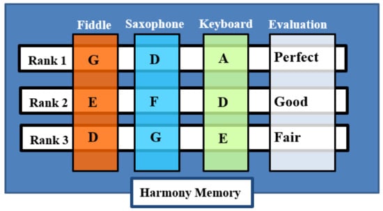 The significant step of the harmony search algorithm is the creation of the Harmony Memory (HM), as illustrated in Figure 3. The HM is inspired by a jazz trio composed of a fiddle, saxophone, and keyboard. In a single performance, the instruments produce random sounds (G, D, A), (E, F, D) and (D, G, E) recorded in HM, respectively, as shown in Figure 3. The evaluations of the harmonic sound are sequenced based on quality, e.g., excellent, good, and fair. This evaluation is improved by practicing. In the research paper, the three sounds of instruments are regarded as the three parameters vC, f, ap of the objectives: FC, FF, FR, and MRR. The randomly produced parameter values in HM are replaced interchangeably to evaluate objective functions with various values. In this way, the searching method increases the chance of finding global extreme points by evaluating all combinations of randomly produced parameter values in HM. This study integrated the HM into the searching process of the Artificial Bee Colony (ABC) algorithm to increase the chance of finding the global extreme point.