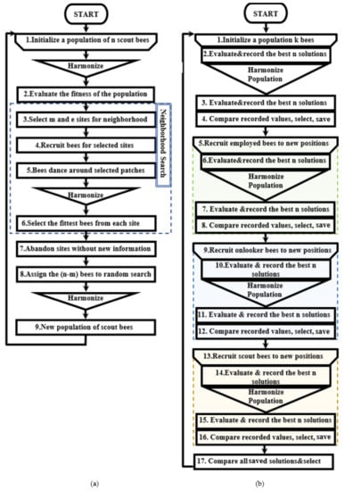 Algorithm procedures: (a) Harmonic Bee Algorithm, (b) Harmonic ABC algorithm.