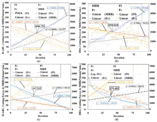 The H-ABC algorithm produces random values for the parameters—cutting speed, feed rate and depth of cut—in the range determined from Table 2. By using the randomly produced parameter values, the objective function for MRR given as in Equation (9) is calculated, sequenced, and compared. The biggest n values are selected in each step, as shown in Figure 4b. When the iteration is completed, the selected best values for MRR are graphed. Additionally, the parameters for the optimal MRR are used to calculate the values of Fc, FF, FR in Equations (4)–(6), respectively. The line fit is drawn for the four objective function values as shown in Figure 5a,c,e and g. The line fits compose a quadrilateral area by intersecting with each other. The optimum value of MRR is at the top of the quadrilateral area. The objective functions Fc, FF, and FR are expected to have the minimum plausible values because the objective function MRR is expected to have maximum plausible value. Therefore, the quadrilateral intersection area of the line fits are used to select the plausible maximum value of MRR instead of a possible maximum value of the Pareto Front. If the possible maximum value of MRR in the Pareto Front were selected, the values of Fc, FF, FR would be unrealistic and counterintuitive. The HBA procedure is shown in Figure 4a. The optimal value is determined in the quadrilateral area as in Figure 5b,d,f and h.