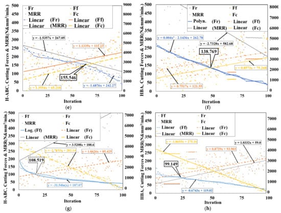 The optimization operation was performed for four objective functions: FC, FF, FR and MRR. FC, FF and FR were minimized and MRR was maximized. In this context, the objectives were handled in turn. The Pareto front was obtained from each of the objective functions by using both H-ABC and HBA. The Pareto front parameters were used to calculate the values of the rest of the objective functions from the optimized one. The values were graphed as shown in Figure 5a–h. The graph was used for the actual selection of the optimal values from the Pareto front. The actual optimal value was selected from the quadrilateral area between the line fits of the objective function results in the graph of the Pareto front.