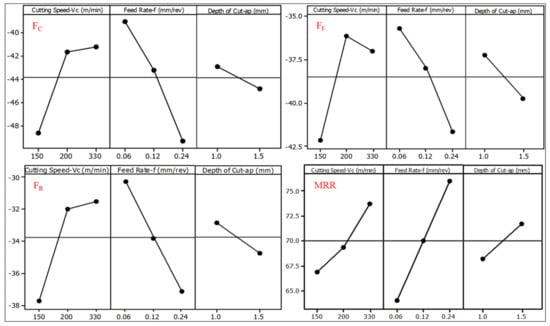 Taguchi provides the optimum results using the S/N ratio and orthogonal arrays according to an experimental plan. In this study, the “smaller is better” approach was selected for all of the cutting forces, while “larger is better” was chosen for the MRR. The Taguchi-based optimization was carried out using Minitab software in the scope of this study. Figure 6 represents the optimum solutions for the response parameters according to the S/N ratios.