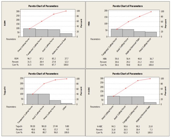 Table 7 includes the optimum conditions, the desirability of each response parameter and their total desirability for the Taguchi, RSM, HBA and H-ABC algorithms, respectively. All of the optimized solutions were evaluated and compared with the predicted values calculated in the previous sections. In Table 7, we discuss their total effectiveness in optimizing the cutting force components and MRR at the same time. For the calculation of the provided values, the maximum and minimum values in the experimental table are regarded as the references in order to determine desirability. After calculating each desirability function belonging to the response parameters, the total desirability is found. Taguchi’s approach provided three optimum conditions, while the others served one solution. As such, six different optimized parameter series were identified. Accordingly, individual and composite desirability values are achieved, because the RSM has the most accurate composite desirability (72.1%), followed by the H-ABC algorithm (64%). For the individual success of the responses under these two methods, H-ABC seems more effective to obtain the optimum cutting forces; however, the RSM is much better for the acquisition of the maximum MRR. In order to determine the optimal solution, this extended approach provides a perspective in manufacturing. Except for this, other methods may provide excellent solutions for specified cutting force/s, but which are insufficient for composite desirability. The Pareto frontiers of the parameters for different types of optimization methods are shown in Figure 7. The findings also confirm the calculated results, as explained and demonstrated before in the paper.