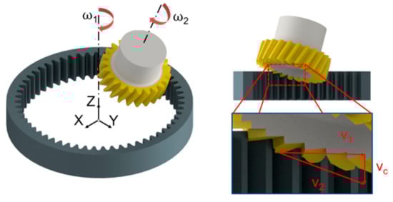 The right-hand side of Figure 1 presents the cutting speed vectors in the case of power skiving internal gears. In this process, the cutting speed due to the rotation of the workgear is presented as V1. Because of the helix angle of the tool, an additional cutting speed exists. This cutting speed, presented as Vc, is responsible for the cutting motion in the process as it provides the main cutting speed for power skiving. By adding the two vectors, the cutting speed of the process can be calculated (V2).
