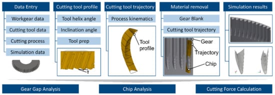 Ren et al. [] investigated the influence of tool eccentricity on surface roughness in gear skiving using experimental as well as simulation-based data. McCloskey et al. [] developed a dexel-based model for the simulation of the power skiving process that was supported by experimental data. Similar to the research of McCloskey et al., Inui et al. [] focused on the development of a triple Drexel-based simulation model for the manufacturing process of internal gears. The results of the model included the non-deformed chip geometry that was produced from the cutting process.