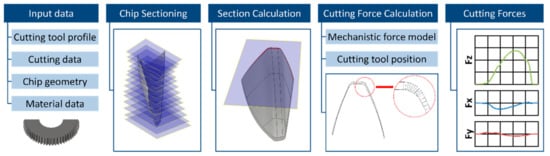 The cutting force calculation in complex kinematic processes requires a series of multifaceted calculations due to the complex nature of the cutting process. Simple equations are not able to accurately predict the cutting forces. The cutting force calculation algorithm leverages the results of the simulation code and, in particular, the non-deformed chip geometry, to predict the loading on the cutting tool. The calculation of the cutting forces is based on the mechanistic force model presented by Kienzle and Victor []. The mechanistic force equations used are only applicable in simple geometries on 2D profiles; it is therefore essential to build a series of steps to ensure the 3D chip geometry is accurately represented in the cutting force model. In order to achieve this a cutting force calculation algorithm was developed. The flowchart of the calculation process is presented in Figure 3. The key parameters of the process used for the simulation of the power skiving process are also used in the calculation of the cutting forces. Mechanistic force models are based on the uncut chip thickness in order to calculate the cutting forces. The complex geometry of the chip does not allow for an analytical calculation of the chip thickness and width. Therefore, the chip is sectioned in a series of planes that represent the successive rake face positions during the cutting process. The section of the non-deformed chip can provide all the information about the cutting forces involved in machining at that particular rotating position. Next, the cross-section is divided in a series of elementary areas in which the elementary cutting forces are calculated. When the elementary cutting forces are calculated throughout the section, they are transformed into the local coordinate system. When the position of the rake face at that particular revolving position is known, the cutting forces can be further transformed to the tool, workgear or machine coordinate systems.