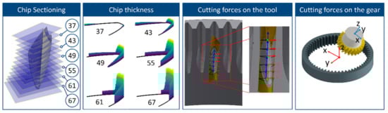 Figure 4 outlines the process for calculating the cutting force components in a chip geometry produced through power skiving. The chip geometry, as outlined in the first step, is sectioned in a series of planes. The planes are numbered based on the order that they were created. Through the analysis of the chip geometry, as presented above, the chip thickness and width were measured. The chip thickness, in a series of revolving positions, is presented in the central part of Figure 4. As it can be observed, the head of the cutter is the part of the cutter in which the biggest chip thickness is observed. Based on the mechanistic model, this is also where the largest cutting force will be applied as the cutting force is proportional to the non-deformed chip thickness. Using the mechanistic force model, the cutting force coefficients can be calculated. The direction of the force is based on the cutting force model and has three components: parallel to the cutting speed, parallel to the cutting edge and one perpendicular to the previous two. After the calculation of the cutting forces on the cutting-edge system, the forces are transformed into the cutting-edge system. This is presented in the third section of Figure 4. The next step in the process is the transformation of the cutting force components to the workgear coordinate system, as presented in the right side of Figure 4.