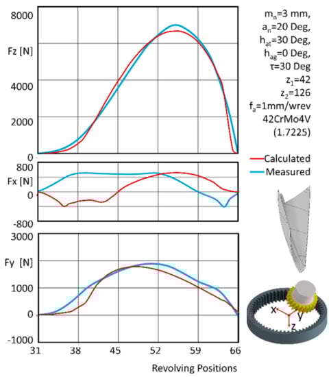 The simulation code was used to analyse the power skiving cutting process. Through analysing the chip geometry, the mechanics of the cutting process and the load on the cutting edge can be analysed. In order to verify the accuracy of the simulation code, the results of Skive3D were compared with results from the literature. Using the same parameters as Jansen [], a set of simulations using Skive3D were performed. The trials focus on the cutting forces for machining one single gear gap, and thus, one single chip. Figure 5 summarises the cutting forces for both the simulation and the experimental trials. As can be seen, the simulation results show good agreement with the experimental results. More specifically, the cutting forces were accurately predicted in all three directions with the Z, the main cutting force direction, showing the best agreement. The small divergence in cutting forces that was observed on the X-axis can be attributed to phenomena that are not considered by the Kienzle Victor cutting force model, such as chip collisions and tool wear. The right part of the figure also presents the solid chip geometry and the coordinate system for both the measured and calculated cutting force components. The Y-axis coincides with the centre of the machined gear gap and rotates with the gear as it is machined, while the Z-axis is on the axis of the machined gear.