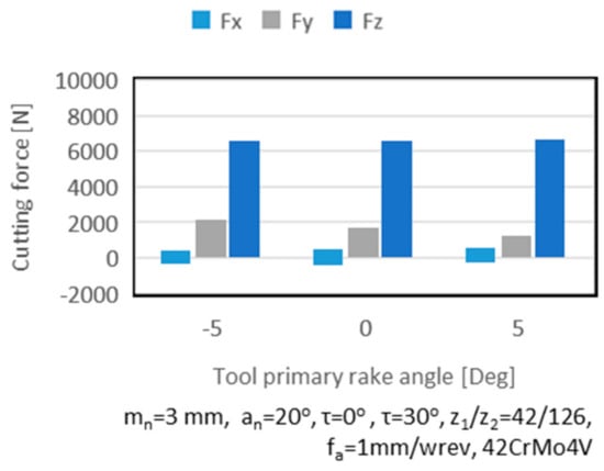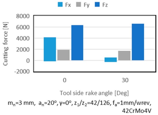 The simulation model created can be used in order to investigate the effect of process and cutting tool parameters on the cutting forces developed during the process. More specifically, the effect of the feed rate, side rake angle and inclination angle on the magnitude of the cutting forces was studied. The maximum and minimum cutting forces were extracted for each of the simulations executed for each axis. Figure 6 presents the influence of the side rake angle in the developed cutting forces. As it can be observed, the decreasing of the side rake angle led to a number of considerable changes on the cutting forces. The cutting force on the Z- and Y-axis were reduced at different levels. The force on the X-axis presented a substantial increase. As the tool side rake angle decreased the contact between the gear, and the tool subsequently increased.