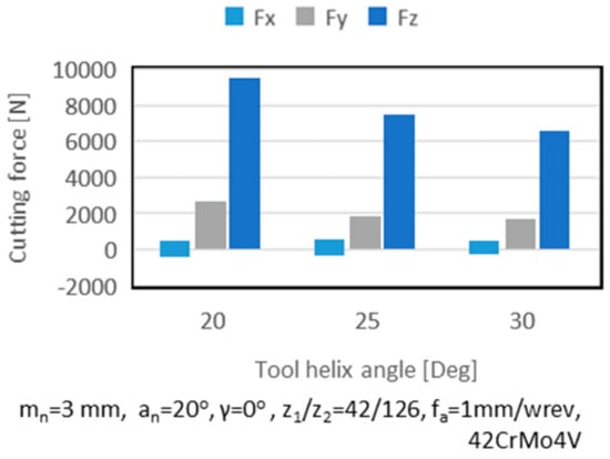 The effect of the tool helix angle on the cutting forces is presented in Figure 9. Larger values of the helix angle lead in increased contact between the tool and the workpiece. Larger values of the tool helix angle lead in the reduction of cutting forces on the Z and Y axes. By increasing the helix angle of the tool, the cutting action takes place across a greater length and, therefore, the load is distributed over more revolving positions, as it was also reported in [].