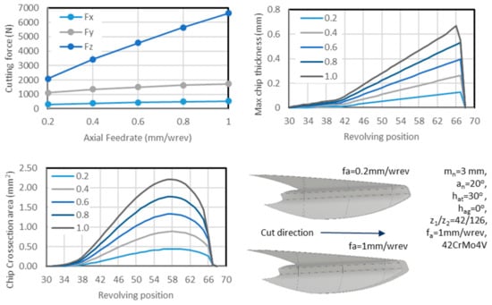 The parameter having the largest effect on the cutting force components amongst the ones available on power skiving was the cutting feedrate. Figure 10 presents the effect of this parameter on the cutting forces on each axis for a full depth of cut machining of a gear. The cutting force on the X-axis is the maximum in magnitude force (positive or negative). As was expected, the cutting force increases with the increase of the feedrate on all three axes, with Z showing the steepest increase in magnitude. The X and Y axes show a modest increase in magnitude with the increase of feedrate. As the feedrate increases, the thickness of the non-deformed chip is increased, thus influencing the cutting force components. On the same figure, the maximum chip thickness as well as the cross-section area of the chip are presented. As it can be observed, the chip thickness increases with the increase of the feedrate, with the maximum value of the chip thickness observed in the later stages of the cut. A similar observation can be made for the cross-sectional area of the chip with the maximum value aligning with the region where the maximum force is observed. The chip morphology for the two extreme feedrates is presented on the bottom-right area of the figure. In both cases, the non-deformed chip geometry is very similar in outer form with a variation towards the later stages of the cut, where the effect of the feedrate is visible.