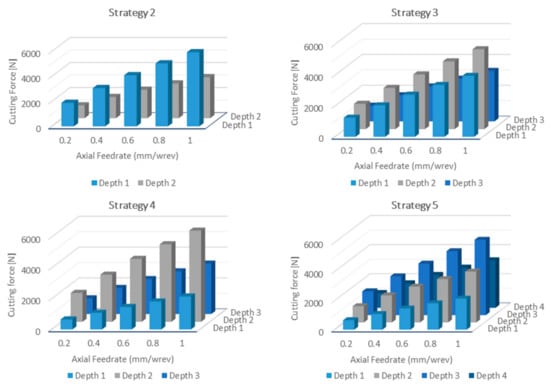 The results for strategy 1 are presented in Figure 10. As it can be observed, high-cutting forces were predicted for the higher feedrates. Similarly, simulations were executed for all the other strategies. For each of the strategies, the maximum value of the Z component of the cutting forces was extracted since, based on the results presented in Section 5, this was the dominant cutting force component. Figure 11 presents the maximum Z component for each of the strategies. As it can be observed, the maximum cutting force is limited in all cases under the 6 kN mark from nearly 7 kN in strategy 1. In all four strategies, the cutting force increases the further into the gear gap the cutting tool proceeds. This is an effect of the increased contact between the tool and the workgear leading to larger amounts of chip width.