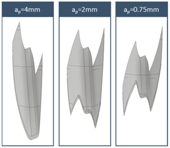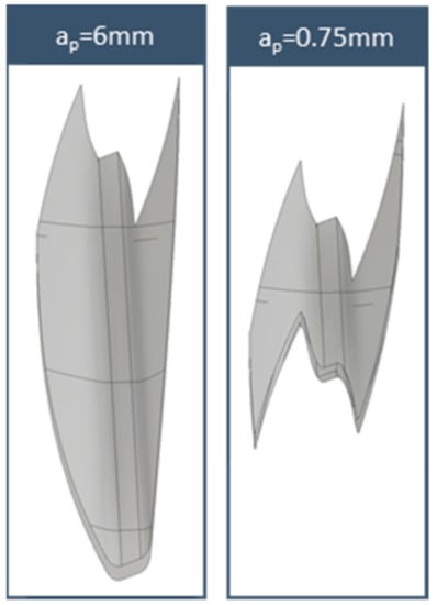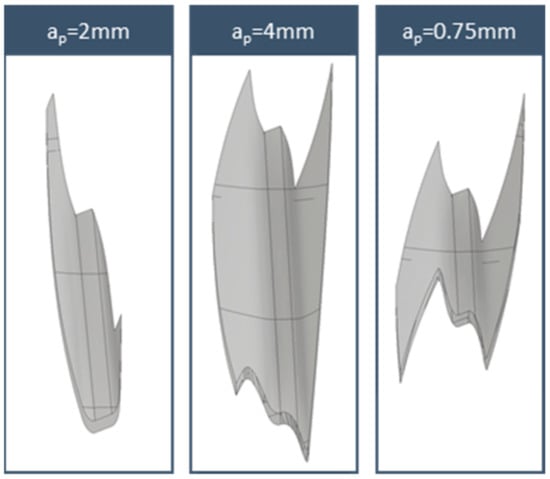 The direction of the rake face of the tool had the greatest impact on the cutting force components, as the main cutting force was analysed to mainly the X and Z components that are dependent on the tool side rake angle. The chip geometry did not have a dramatic change its size; however, because of the side rake angle, the tool swept the chip in a different manner that led to the change of cutting forces. Figure 7 presents the geometry of the non-deformed chips as well as a cross-section of the chip geometry in the indicated rake face plane.