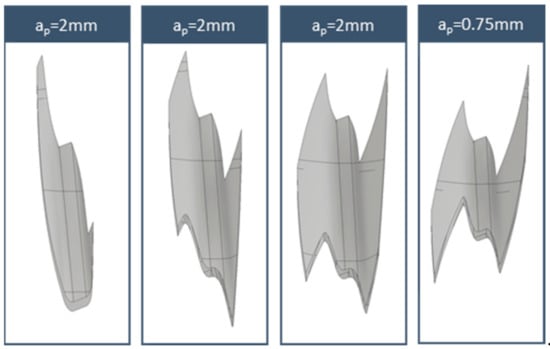 The chip geometries for each of the strategies in the midpoint of fa = 0.6 mm/wrev are presented in Figure 12, Figure 13, Figure 14 and Figure 15. The feedrate had a minimum effect in the macro geometry of the chip, as is presented in Figure 10. In all cases, the first depth of cut produced large chips with a general U-shaped form with the leading flank having a heavier chip load and the maximum chip thickness towards the final revolving positions. Consecutive passes tend to generate a Z- or M-type chip geometries with different widths directly linked with the depth of cut. One aspect worth noting is the increase in the chip length as the machining strategy 5 progresses.