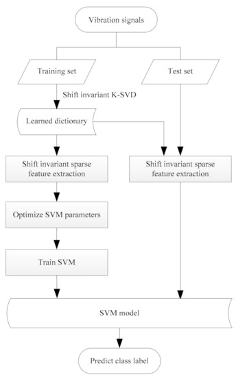 The remaining part of the paper includes: Section 2 introduces feature extraction method with shift invariant K-SVD. In Section 3, the pattern recognition method using optimized SVM is demonstrated. Then, the proposed bearing fault diagnosis model is presented in Section 4. Subsequently in Section 5, the experiment of rolling bearing fault is conducted to validate the effectiveness of the proposed method. At last, in Section 6, the conclusion is acquired.