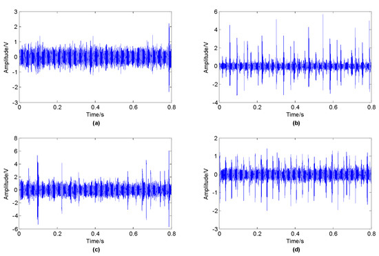 Vibration signals corresponding to different running statuses: (a) Normal; (b) inner race fault; (c) rolling element fault; (d) outer race fault.