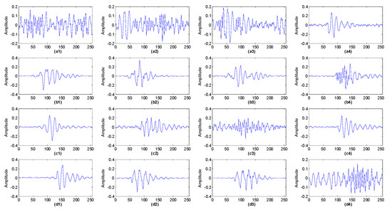 The learned basis functions corresponding to four running states: (a1–a4) normal; (b1–b4) inner race fault; (c1–c4) rolling element fault; (d1–d4) outer race fault.