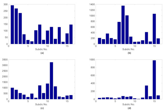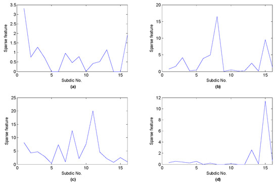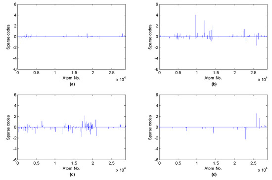 After basis functions with regard to each class have been learned, the sub-dictionaries for each class can be formed, and thus the over-complete dictionary can be constructed by concatenating the sub-dictionaries. Using the over-complete dictionary, the sparse coefficients of all samples are calculated with the sparsity prior 10 and the sparse coefficients of four test samples with respect to four classes are demonstrated in Figure 5. As shown in the figure, each sample is more likely to be activated by the atoms corresponding to the category of the sample. Then, the shift invariant sparse feature can be computed based on the sparse codes and l1 norm, l2 norm or M-Max. Hence, 16-dimensional (l1 norm, l2 norm and Max), 32-dimensional (M = 2), or 48-dimensional (M = 3) feature vector is respectively acquired with regard to each sample.