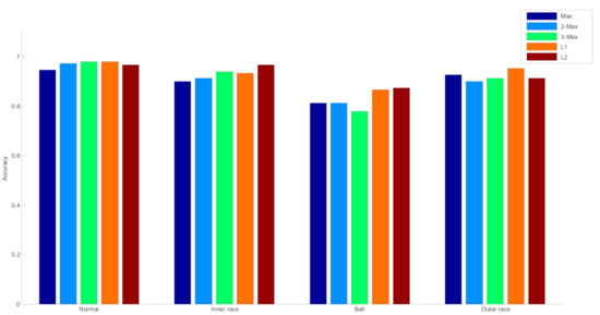 Table 1 indicates that the different methods to construct sparse features have great impact on diagnosis result, in which the sparse feature using L1 (l1 norm) achieves the highest accuracy and thus l1 norm is utilized in the subsequent classification task using optimized SVM. The accuracy of the feature extraction method based on Max (Maximum absolute values) is the lowest, which is due to that the Max method ignores a lot of important sparse feature information in the sparse codes. However, with the increase of M, the accuracy is improved. Figure 8 shows that on the whole, the rolling element fault acquired the worst result, which signifies that rolling element fault is very complicated and harder to recognize. For normal and outer race fault, the method based on L1 (l1 norm) outperforms all the other methods.