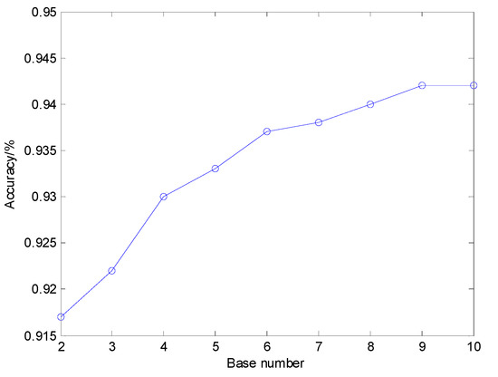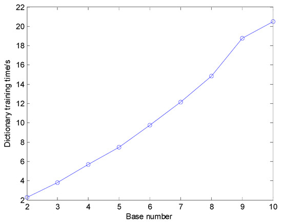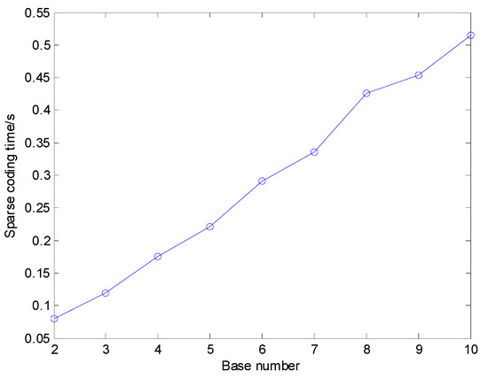 For different K, the dictionary size increased rapidly as K increases, whose classification results and dictionary training time are illustrated in Figure 9 and Figure 10, respectively. The average sparse coding time for one sample using different K is shown in Figure 11. Figure 9 shows that in general the diagnosis accuracy grows with the increasing number of base functions K, yet becomes steady when dictionary size reaches a relatively large value. Nevertheless, Figure 10 and Figure 11 show that the dictionary training time rises quickly if dictionary size is increased and then the time of sparse coding for the training samples and test samples also grows quickly. Therefore, a proper value of K should be selected in addition to considering the diagnosis precision, the computing, and memory consumption must also be taken into account comprehensively. In this paper, K is set to 4.