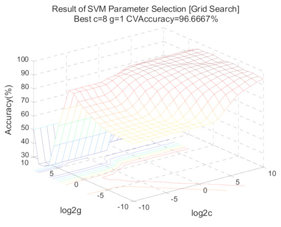 After feature extraction, the intelligent machinery fault diagnosis is the problem of classification, which belongs to the problem of pattern recognition. Thus, the pattern recognition methods can be used, e.g., support vector machine (SVM) [27,28,29,30,31], artificial neural network (ANN) [32], deep learning [33], etc. Compared with neural network, SVM [34] utilizes structural risk minimization, and can thus avoid over-fitting, local minimization, and low convergence speed. Besides, SVM is more effective for training samples with a small number and high dimension. When the data cannot be linearly discriminated, a kernel function which can translate the data to high dimensional feature space is always utilized in SVM, where the radial basis function (RBF) kernel is the most broadly employed. The discrimination ability of SVM is greatly affected by the parameters including kernel function parameter and penalization factor, hence it is very essential to conduct the optimization of the parameters by means of intelligent evolutionary algorithms, e.g., particle swarm optimization (PSO) [35] and generic algorithm (GA) [36,37]. For machinery fault diagnosis, SVM with optimized parameters has been widely used. Lu et al. applied an adaptive feature extraction method and optimized SVM based on PSO to drivetrain gearbox fault diagnosis [29]. Wang et al. utilized SVM based on GA to realize bearing fault diagnosis [30]. Three methods including grid search, GA, and PSO are respectively conducted to optimize SVM in this paper.